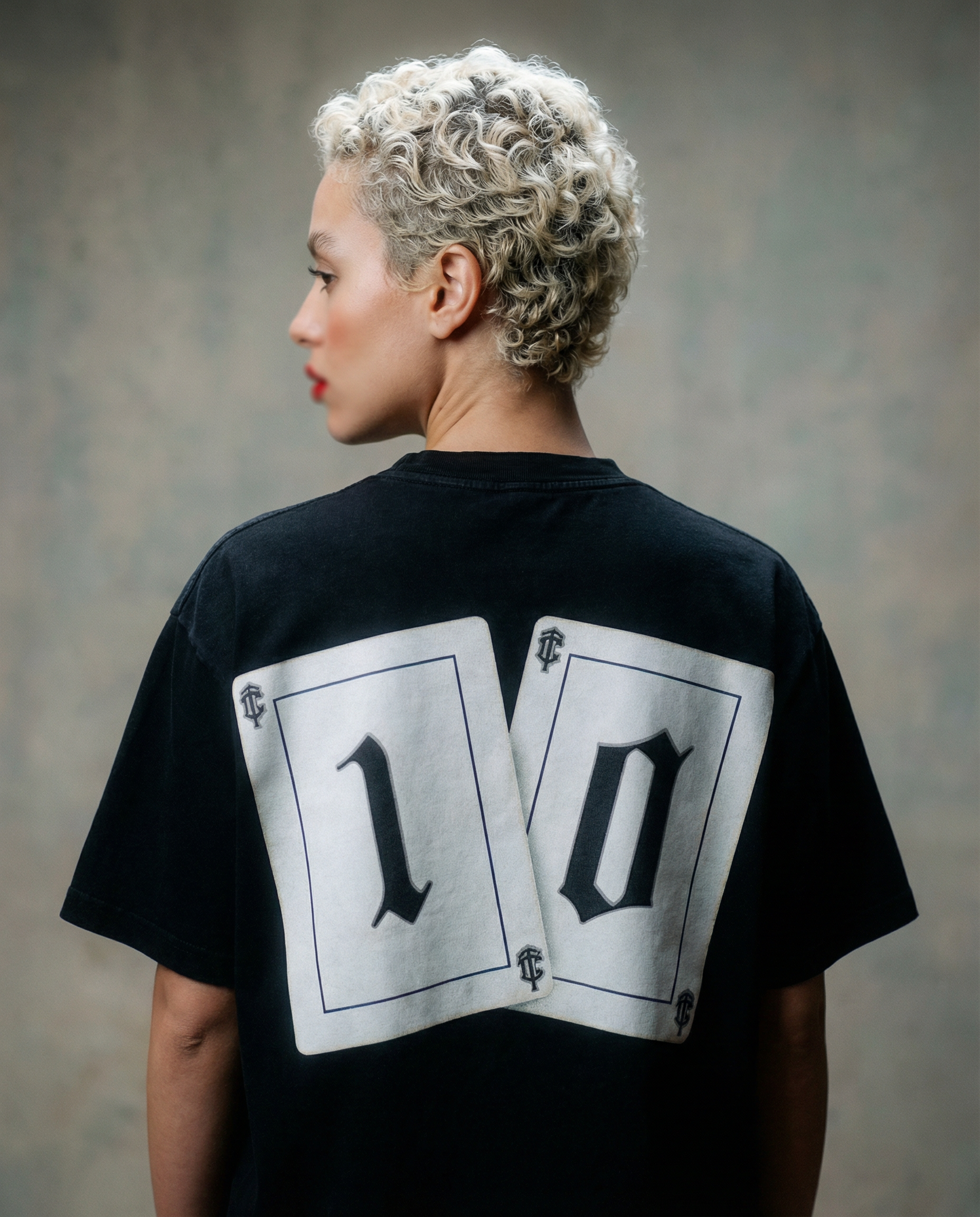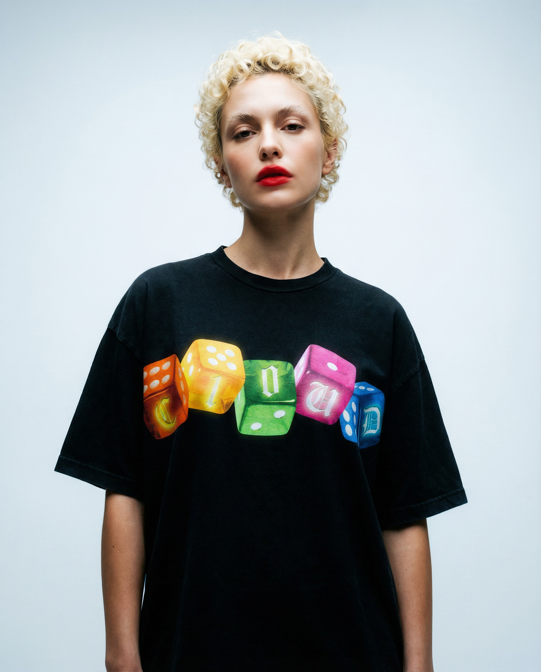 This tee is a statement piece built on risk, vision, and reward. The front features vibrant, high gloss dice spelling out Cloud10, symbolizing chance, hustle, and the courage to roll the dice on your dreams. The bold colors pop against the black fabric, giving it a high-impact, luxury streetwear feel.