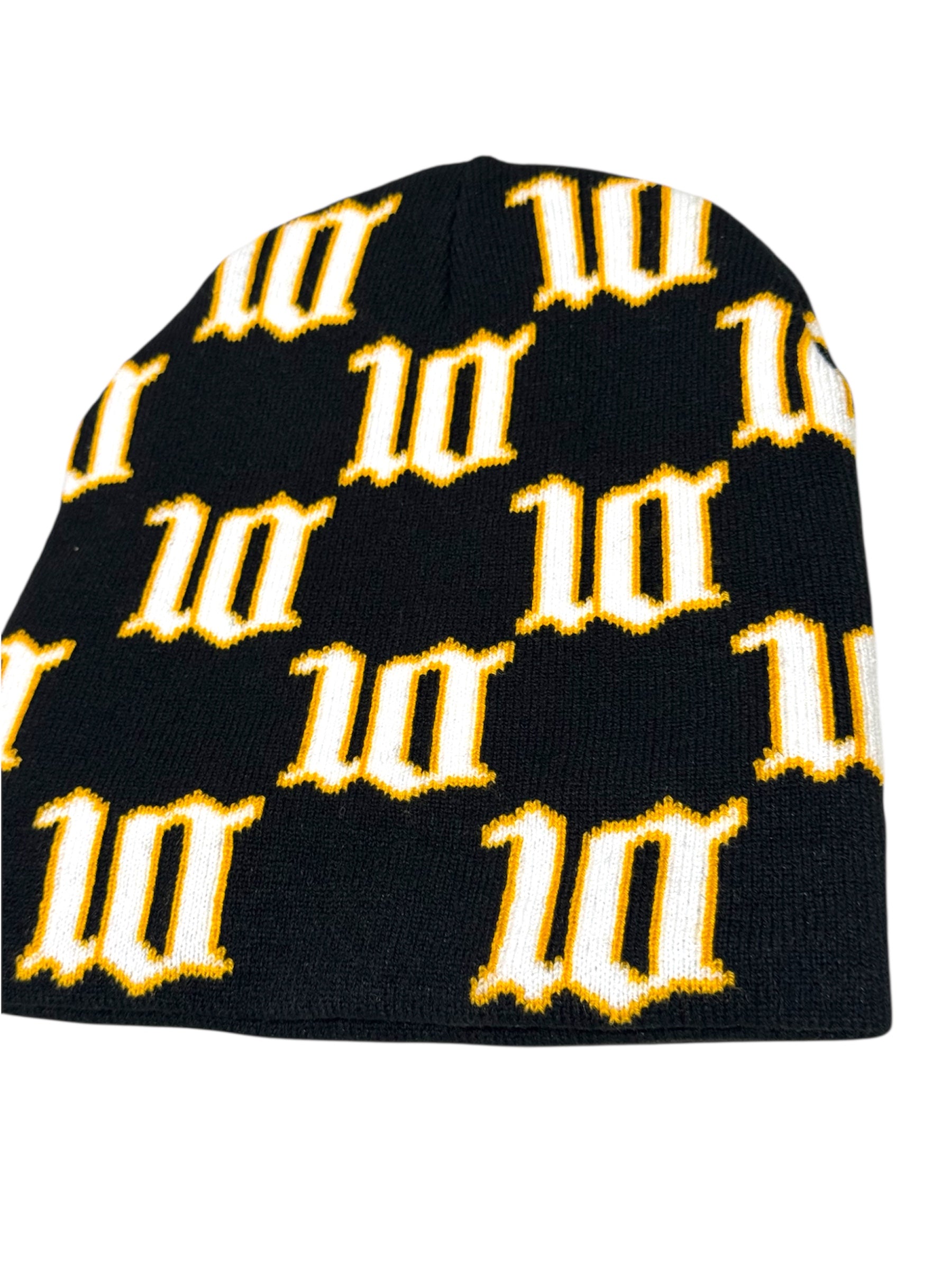 This black knit beanie features the signature gothic “10” logo repeated throughout in crisp white outlined with golden yellow,