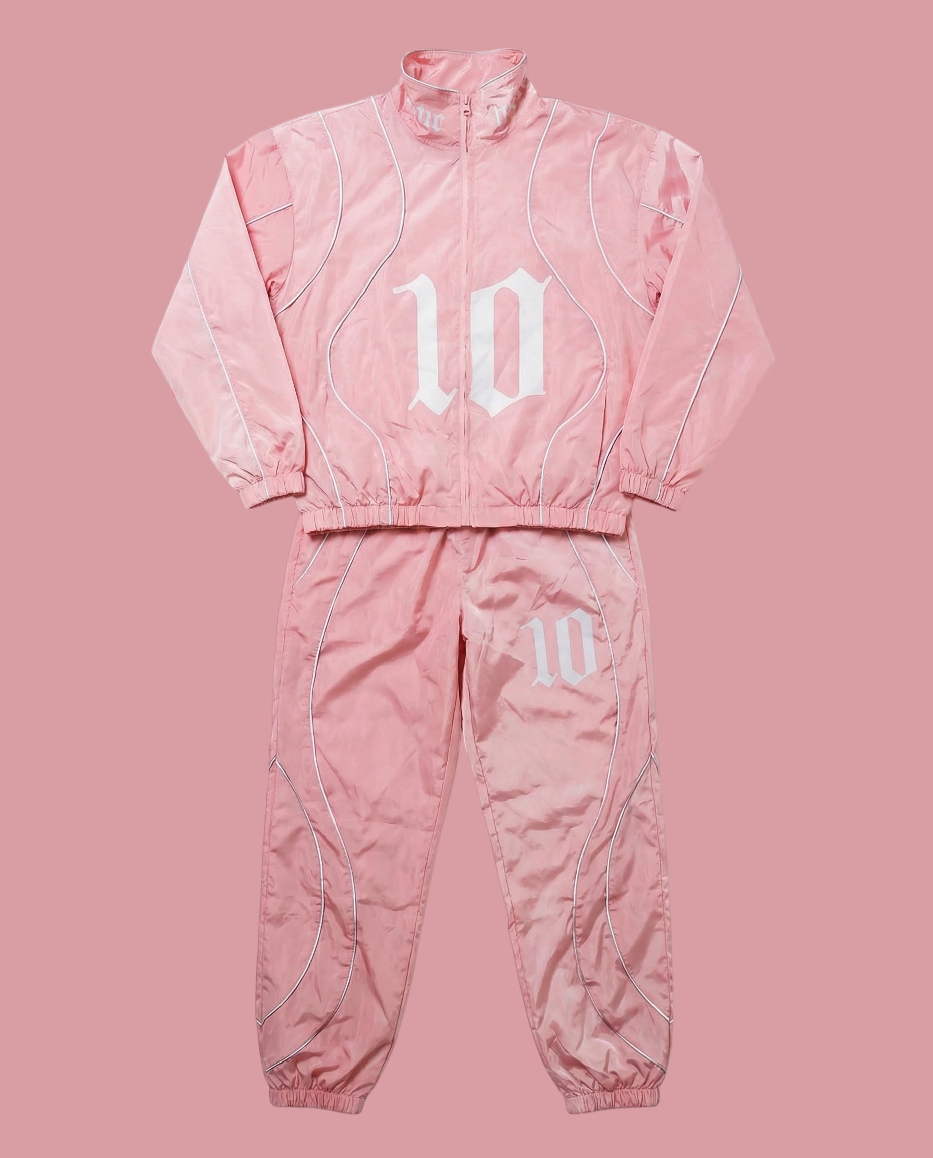 The jacket is finished with a structured fit, full-zip closure, and high collar for wind protection, while the matching pants offer a relaxed athletic silhouette with functional mobility. Signature “10” branding anchors the set, representing elevation beyond the expected.