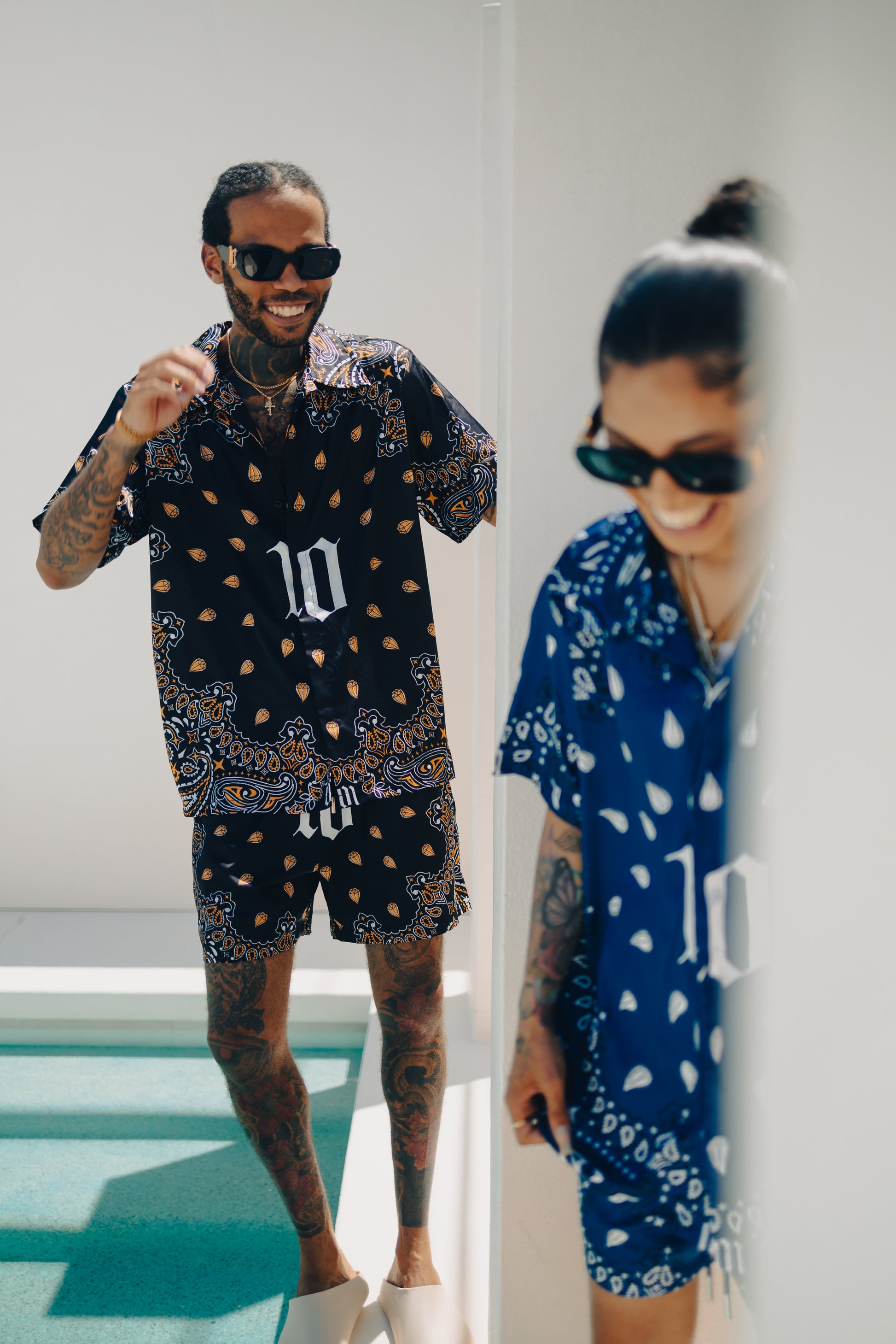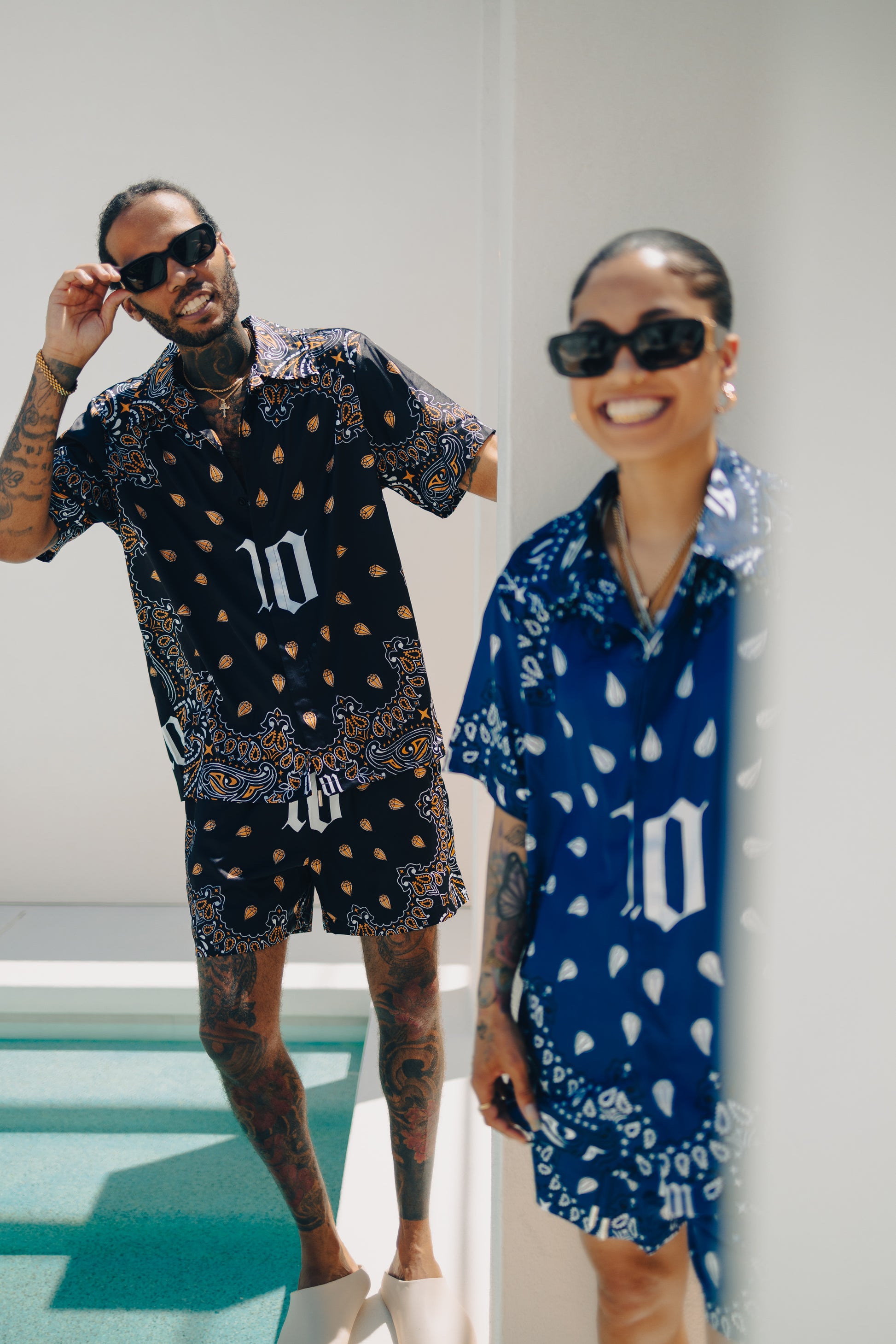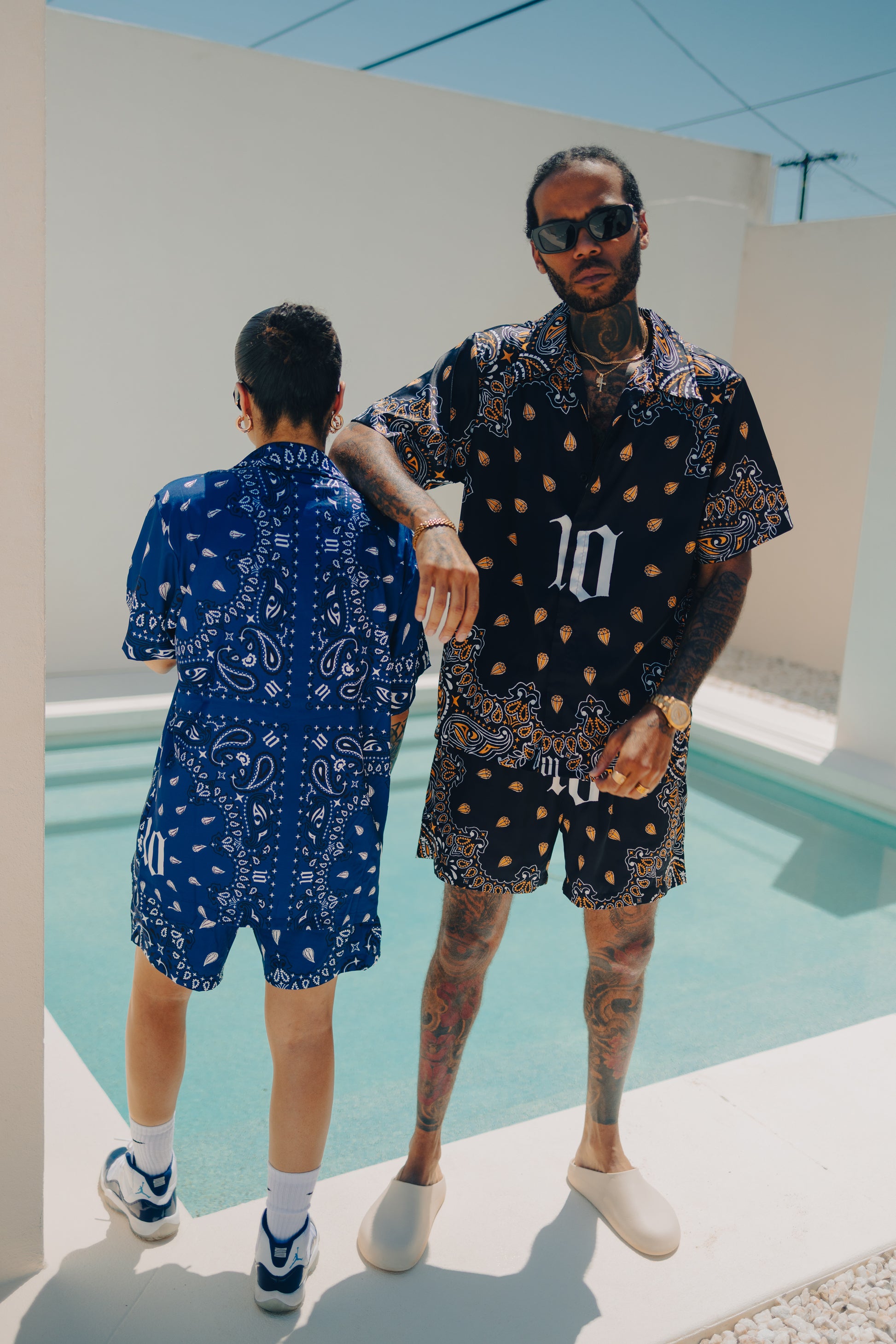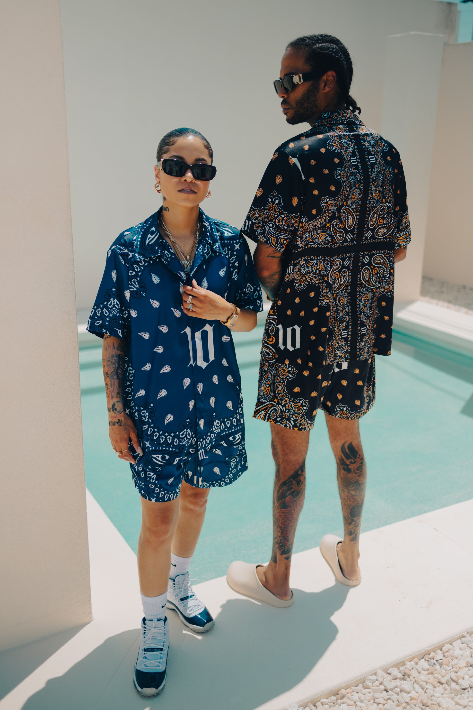 "Above it All” Collection embodies the essence of luxury streetwear in summer form a reflection of ambition, cool confidence, and timeless elevation. The silk two-piece paisley sets merge classic bandana culture with Cloud10’s signature rain drop logo and bold “10” mark a symbol of pushing past limits and doing it in effortless style.